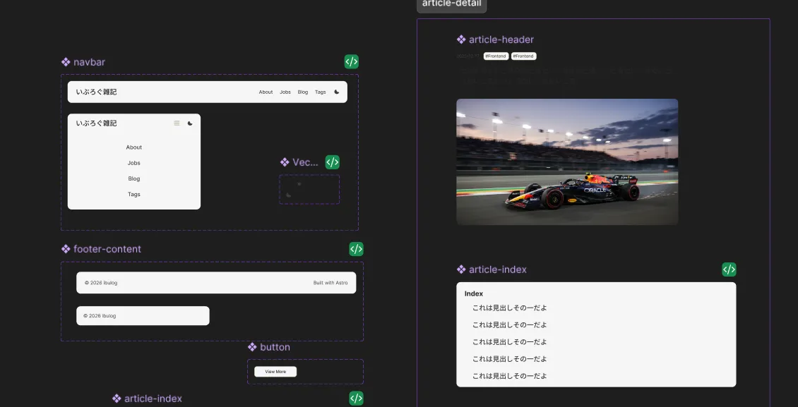 まずはFigma上のコンポーネントをAstroコンポーネントとして実装してもらって、それを利用してページ側を実装してもらう流れで進めました。