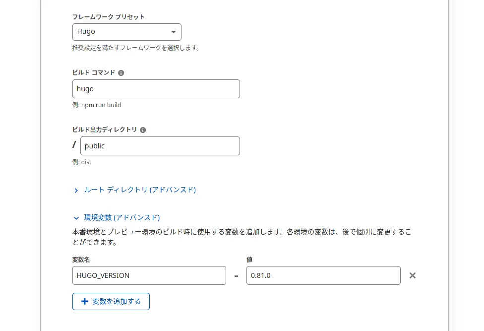 環境変数のHUGO_VERSIONだけは必ず指定しましょう。これを指定しないと古いバージョンのHugoが使われ、ビルドに失敗します(失敗しました)。