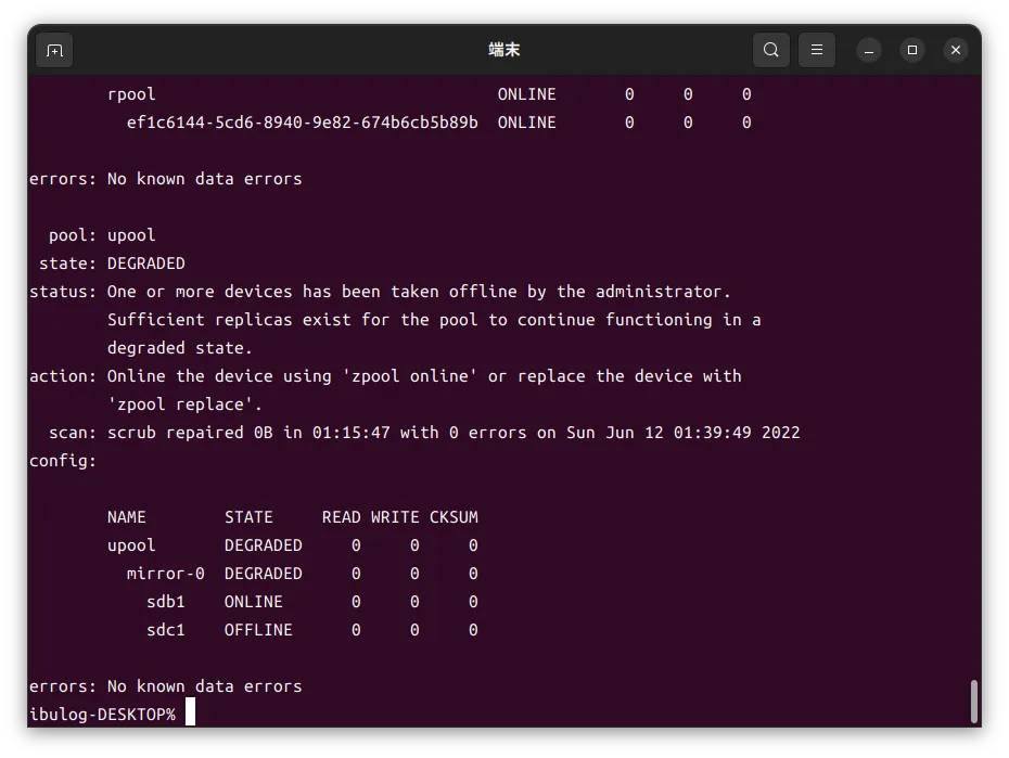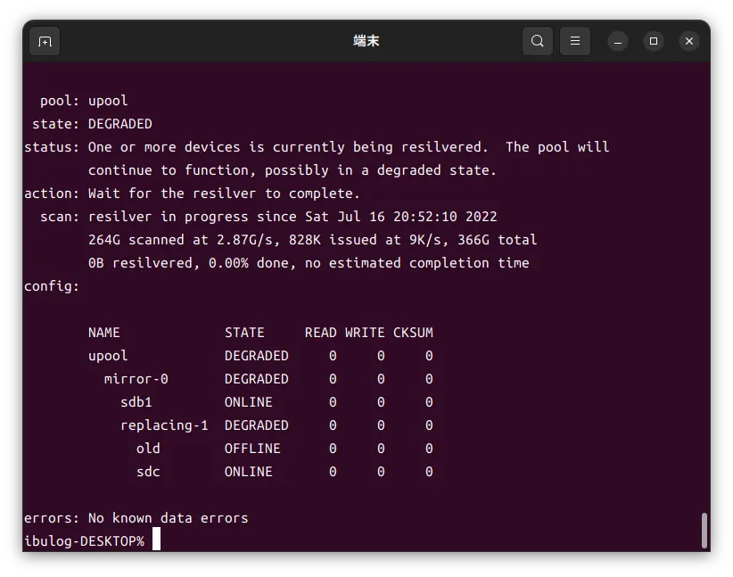 sudo zpool offline upool sdc1 2. HDDを交換する